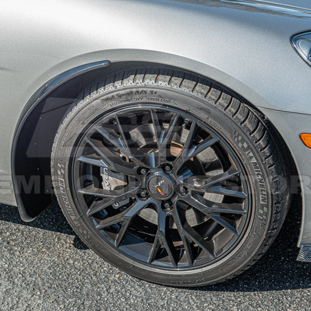 The package includes both front and rear splash guards, which are designed to protect the lower body of the vehicle from mud, dirt, rocks, and other debris that can be kicked up by the tires while driving. The splash guards help to minimize damage to the paintwork and prevent accumulation of mud and grime, keeping the Corvette's exterior cleaner. In addition to the splash guards, the package also includes Corvette C6 Widebody Rear Side Fenders. These fenders provide a wider and more aggressive look to the rear end of the vehicle, enhancing its overall aesthetic appeal.